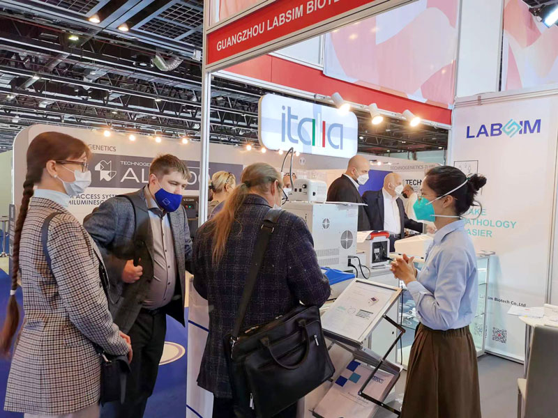 展会现场蓝勃生物明星产品之一——荧光系列产品解决方案。荧光系列产品以最大程度满足不同国家和地区客户、不同应用场景检测需求的特点,现场得到众多国际访客的关注。