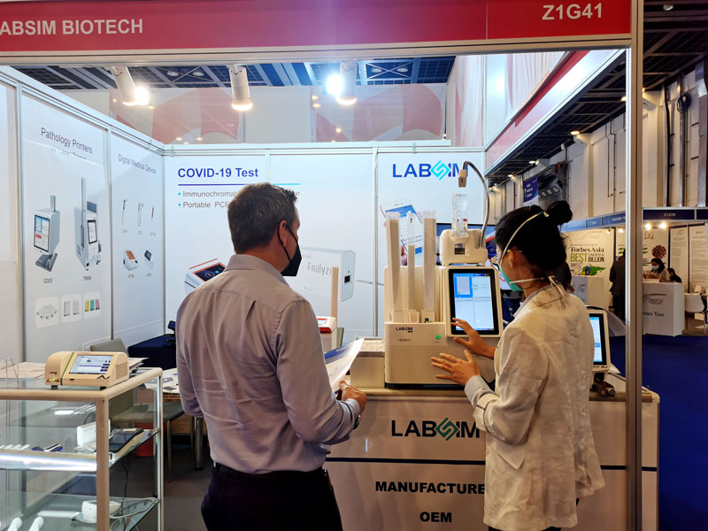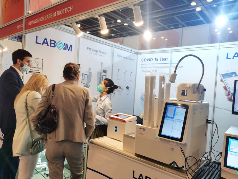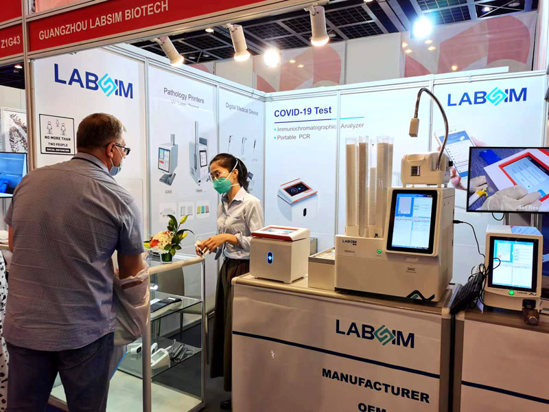 本届展会上蓝勃生物携干式荧光免疫分析仪AFS-1000、手持式干式荧光免疫分析仪AFS430、胶体金免疫层析分析仪AGS1000,与组织盒激光打号机TB586UV、载玻片热转印打号机G304等明星产品亮相,展会现场吸引了大批观众前来沟通交流。